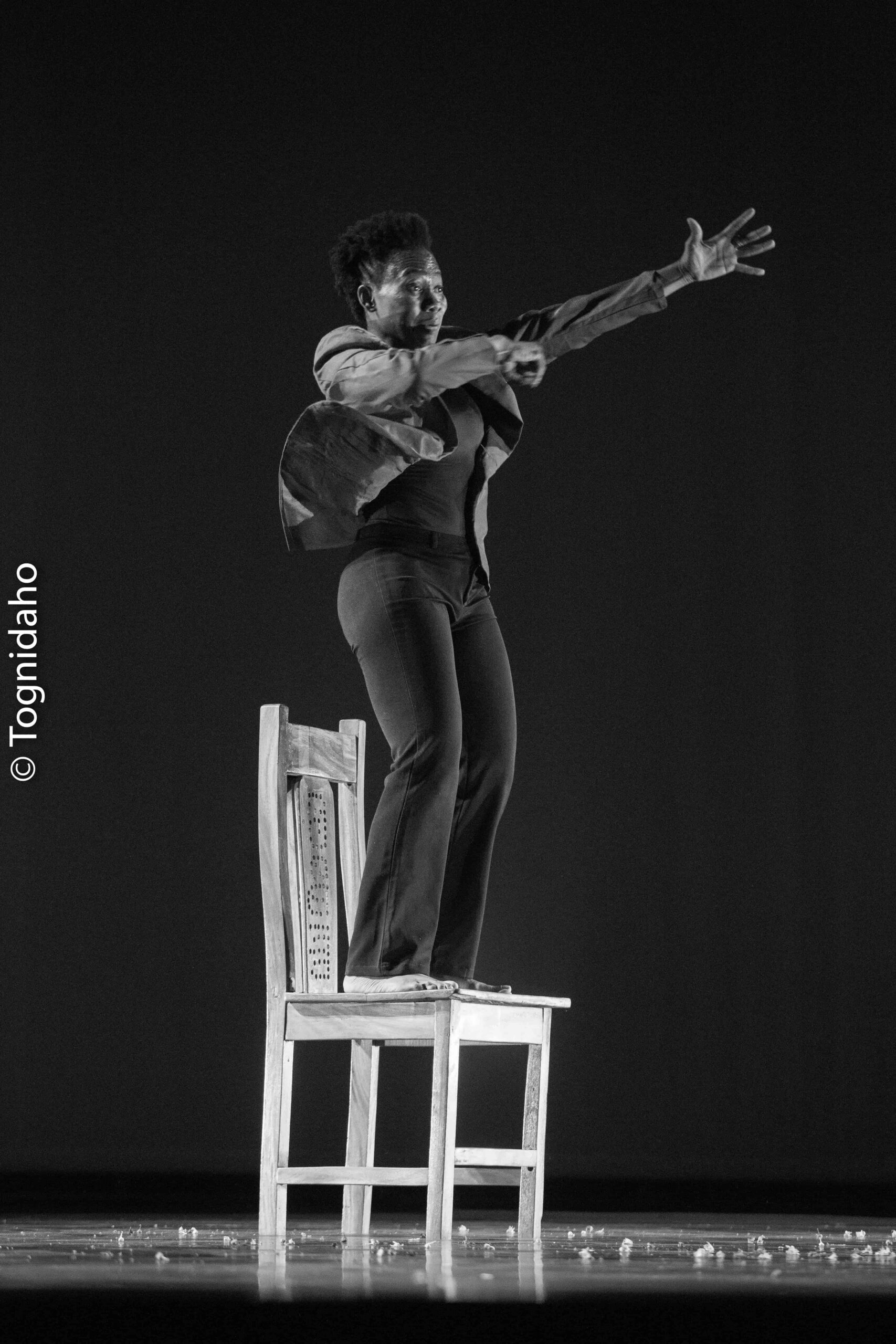 « Gbé miton » signifie « nos voix » en fongbé, un titre qui joue sur l’ambiguïté avec « Gbè miton » (nos vies). Cette création explore le parcours des danseurs au Bénin et en Afrique, interrogeant la quête de pouvoir et les sacrifices, parfois sombres, que l’on est prêt à faire pour réussir. La pièce aborde aussi la place complexe de la femme dans un milieu où les contraintes sociales et familiales restent fortes. Elle met en lumière le manque de structuration politique pour les artistes, tout en portant l’espoir d’un changement. Sur scène, quatre danseurs luttent pour faire exister leur voix. Chorégraphiquement, je déconstruis le traditionnel pour le mêler à l’univers urbain. C’est une œuvre organique, créée sur mesure selon la personnalité de chaque interprète, accompagnée d’une création musicale originale intégrant du beatbox et des rythmes ancestraux.
